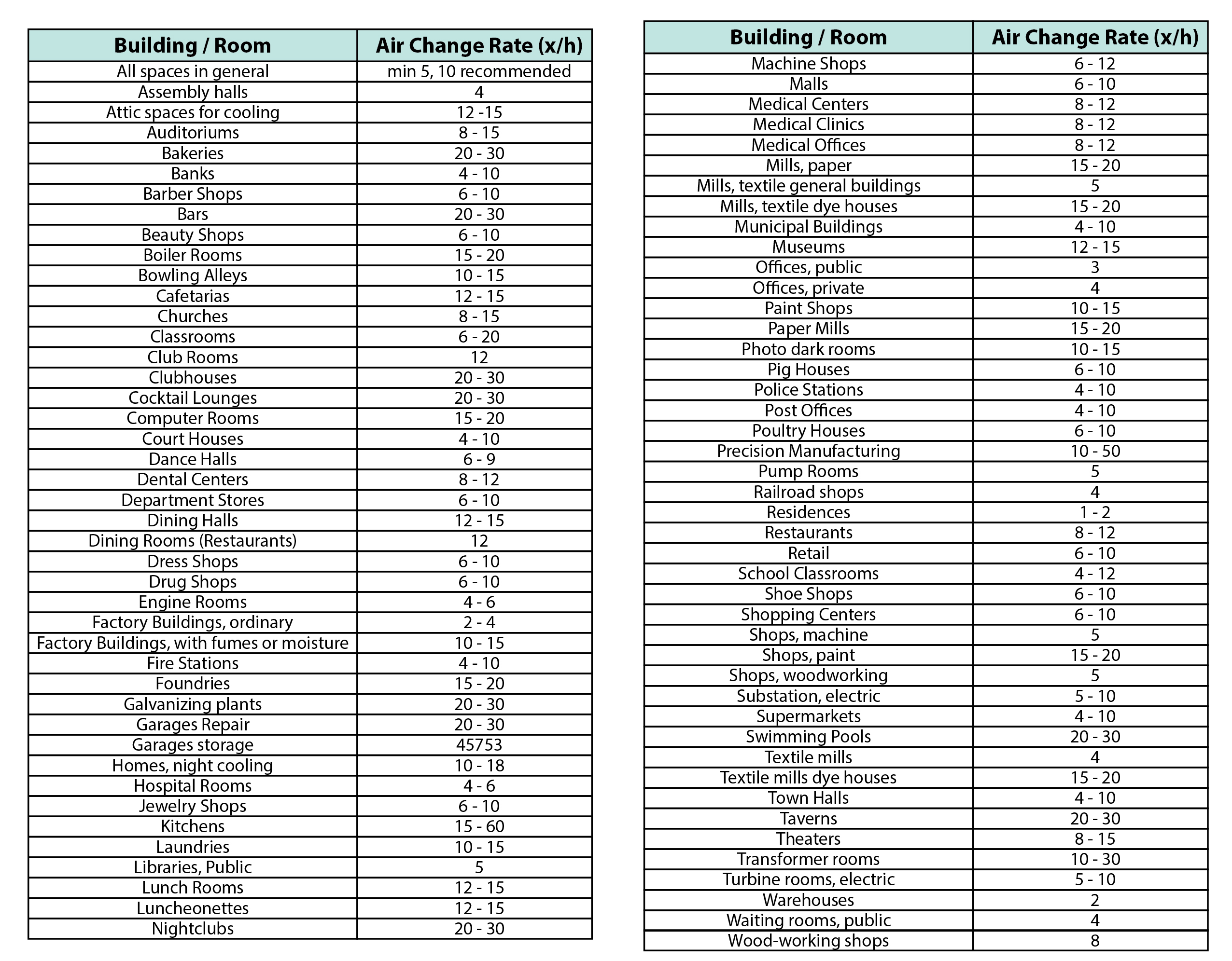 Konsep dasar dari menentukan jumlah ventilasi agar sesuai kebutuhan serta perhitungan CMH-nya yaitu, volume bangunan atau gedung dikali dengan berapa pertukaran udara per-jam nya, lalu dibagi dengan kapasitas kipas / exhaust fan yang dikehendaki. Berapa pertukaran udara per-jam nya (atau Bahasa inggris nya, Air exchange per hour atau disingkat ACH) tergantung dari tipe dan penggunaan gedung terkait, dapat dilihat pada tabel di bawah ini.